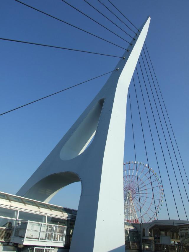 東京湾岸道路と首都高速道路に分割されている台場地区と青海地区を繋ぐ歩行者専用の3径間連続斜張橋。